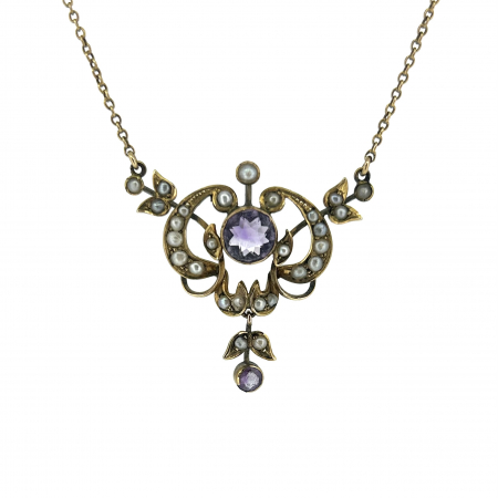 • 9ct Gold Art Nouveau Seed Pearl & Amethyst Necklace