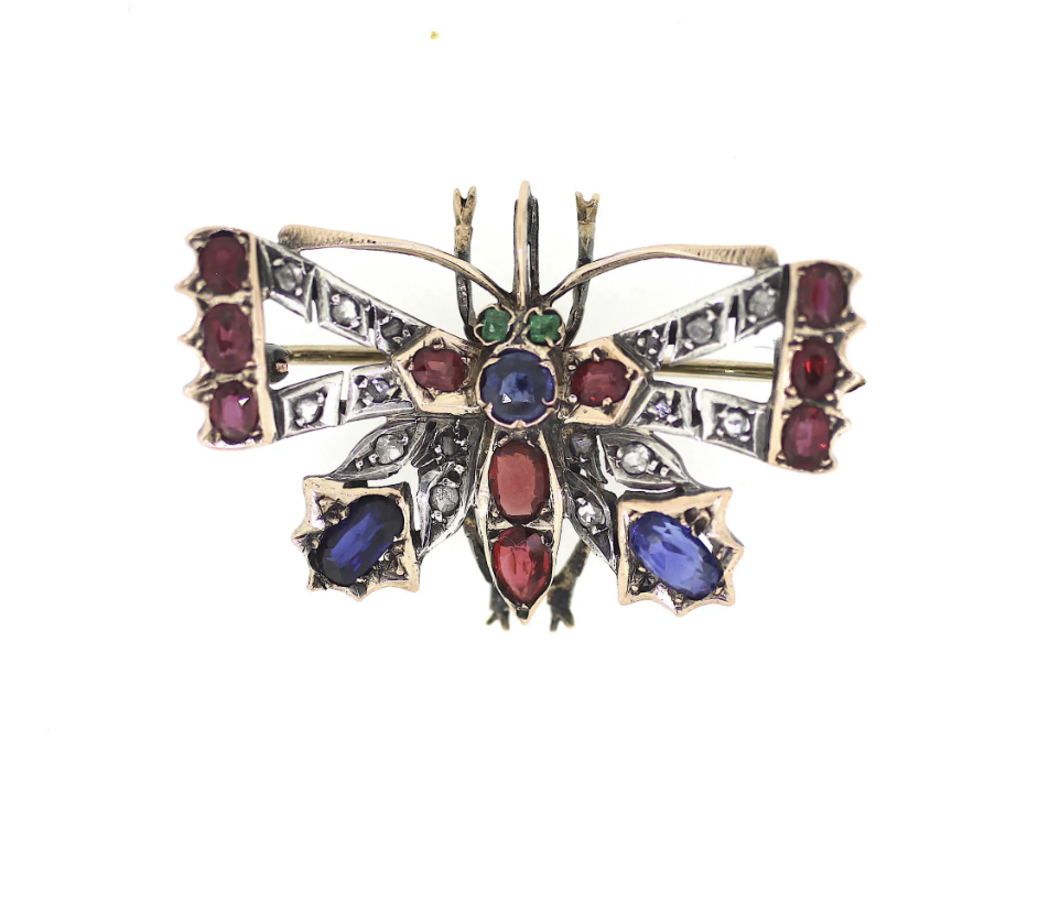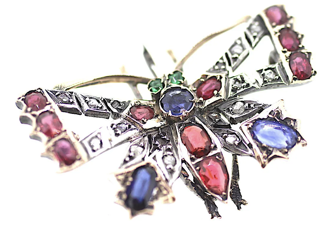This stunning example of Victorian jewellery uses a collection of natural Rubies, Sapphires, Emeralds and Diamonds to create a beautiful Butterfly look.