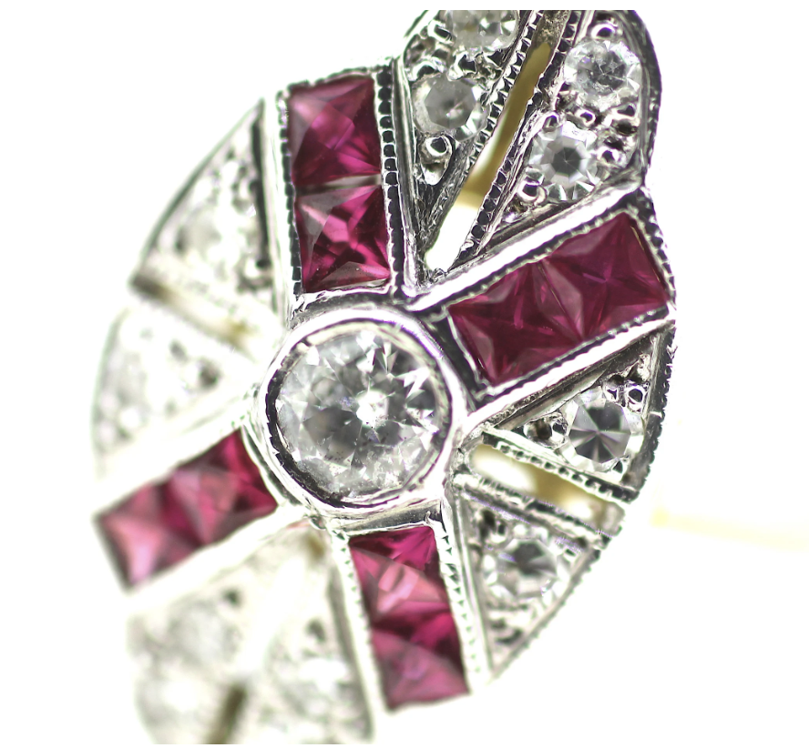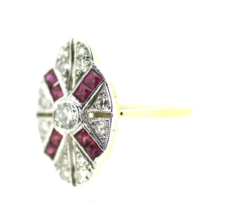 An Art Deco British ring set with genuine Ruby and Diamond gemstones.