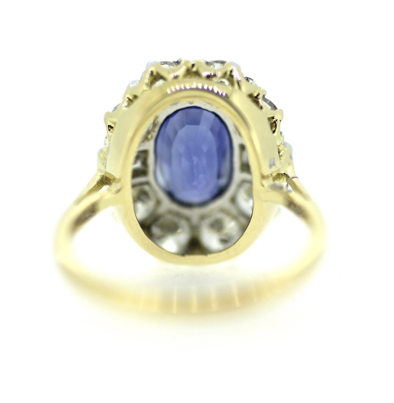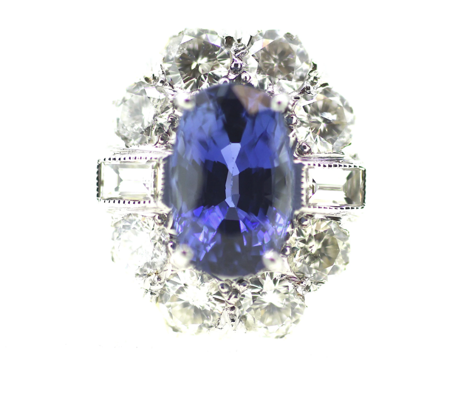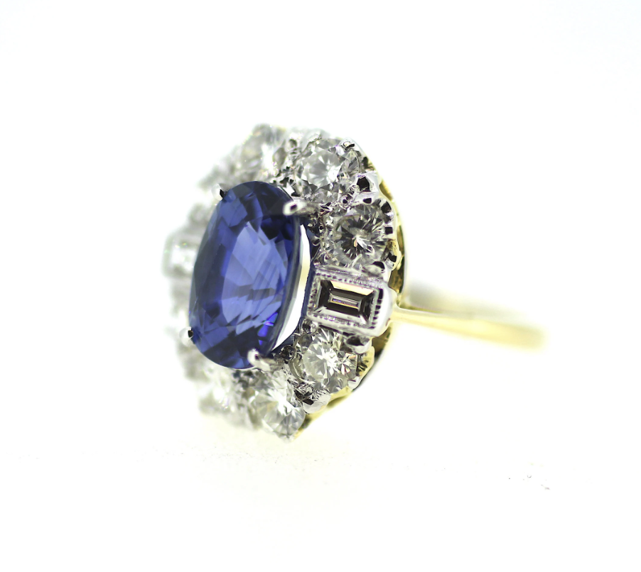 The centre sapphire is 3.00ct and the surrounding diamonds have a total weight of 1.40ct.