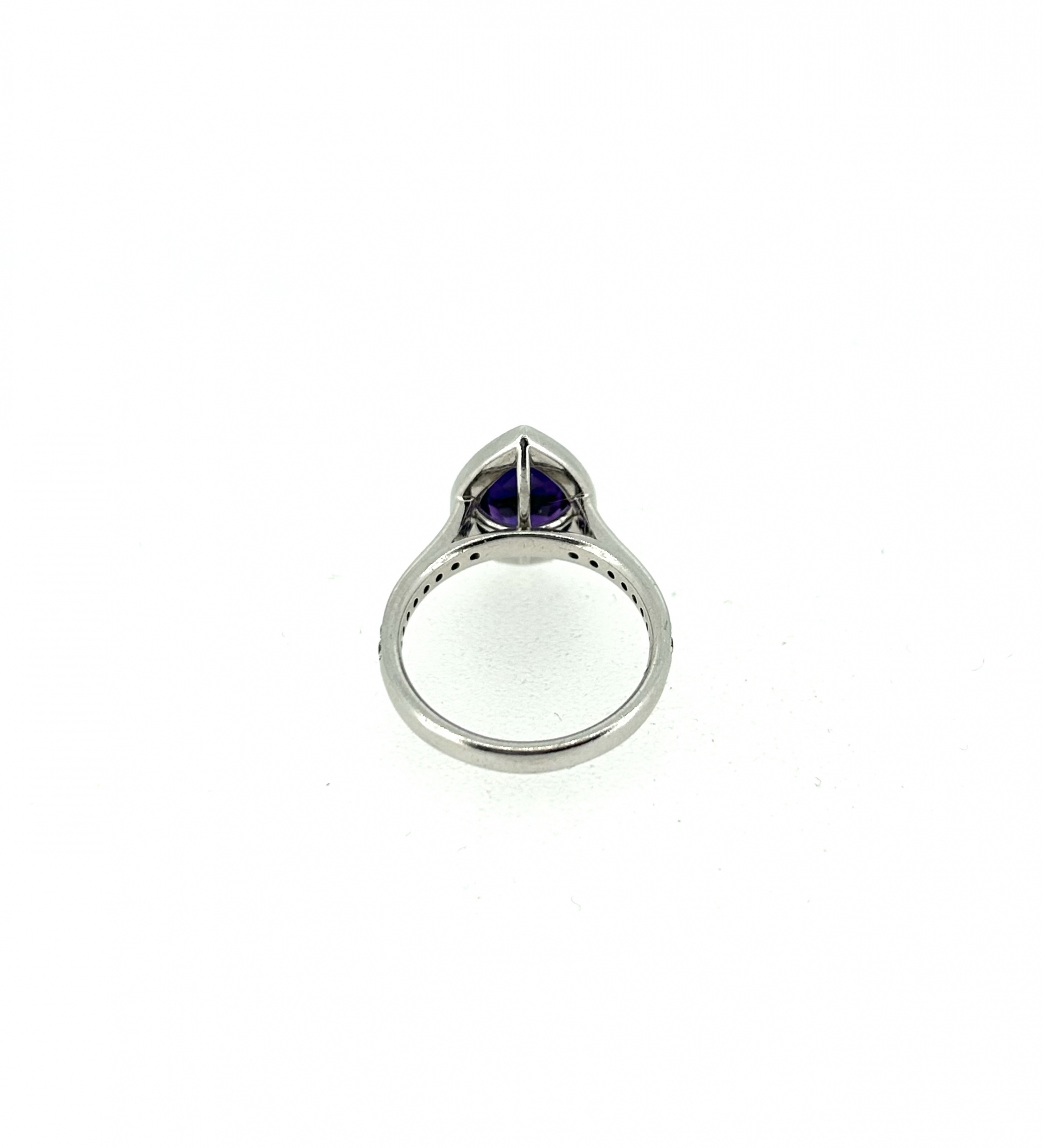 This piece has a pear shaped Amethyst in the centre with a halo of Diamonds around it and down the shoulders.