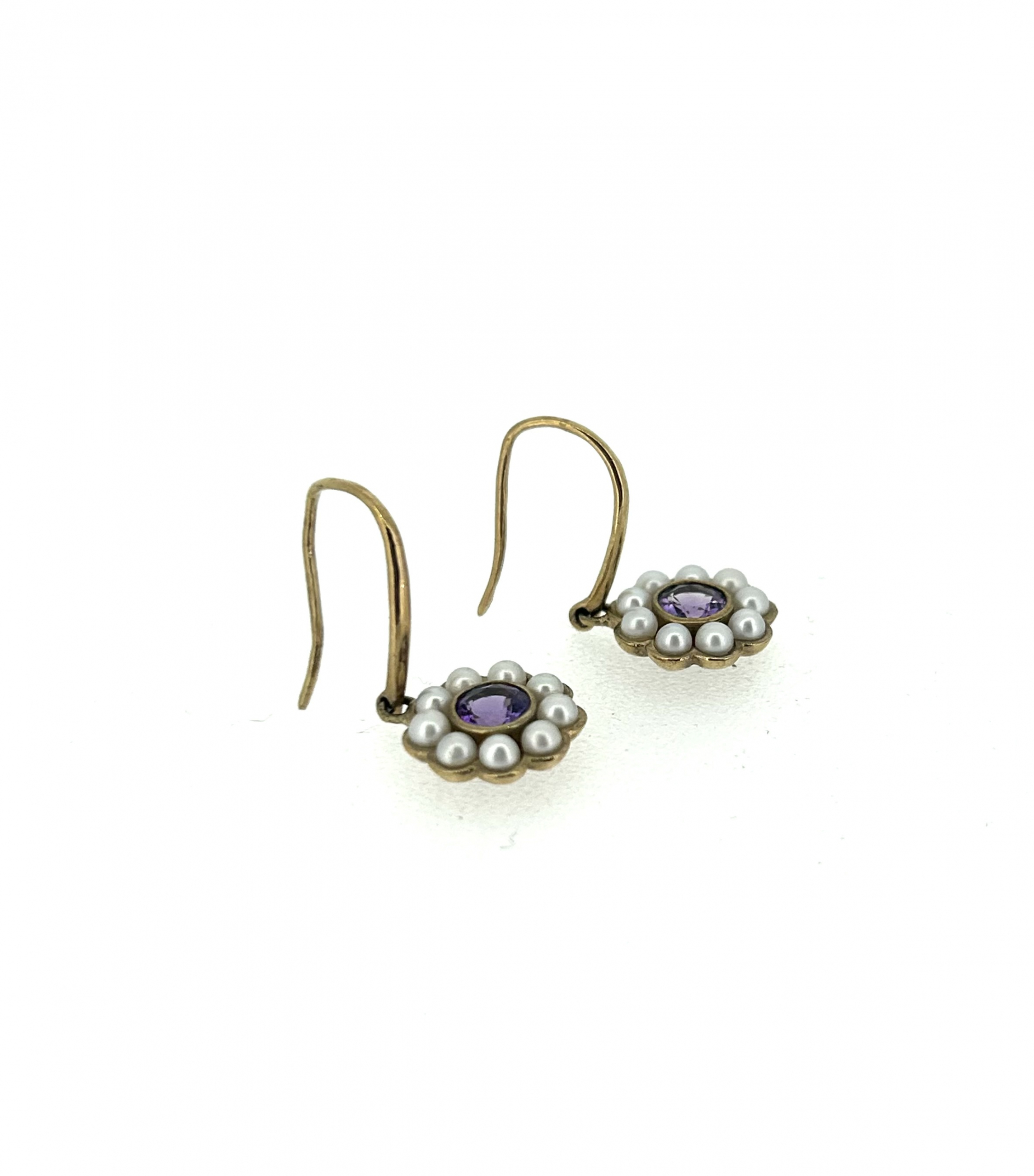 A unique pair of 9ct Yellow Gold, Amethyst and Pearl dangle earrings.