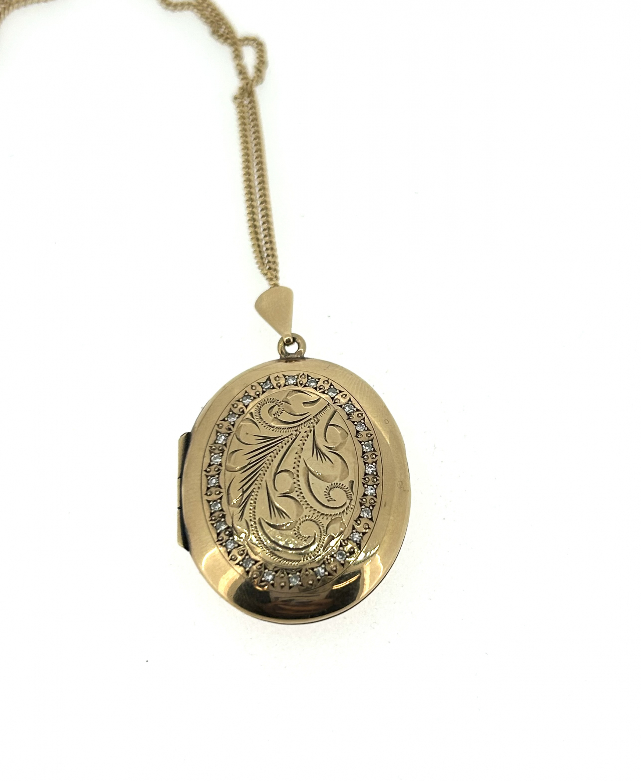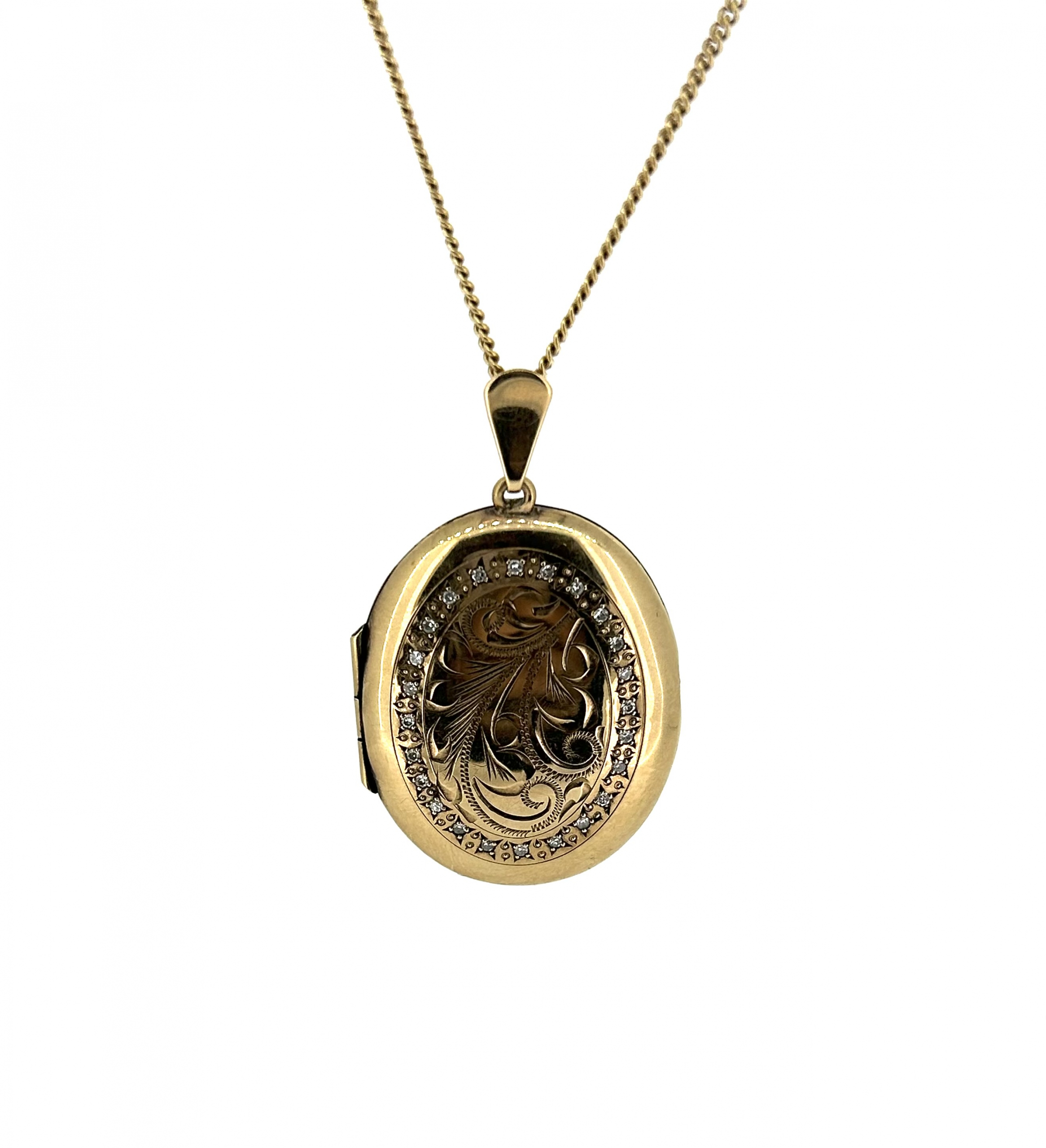 A lovely 9ct Yellow Gold and Diamond vintage locket necklace with a curb chain and spring ring clasp.