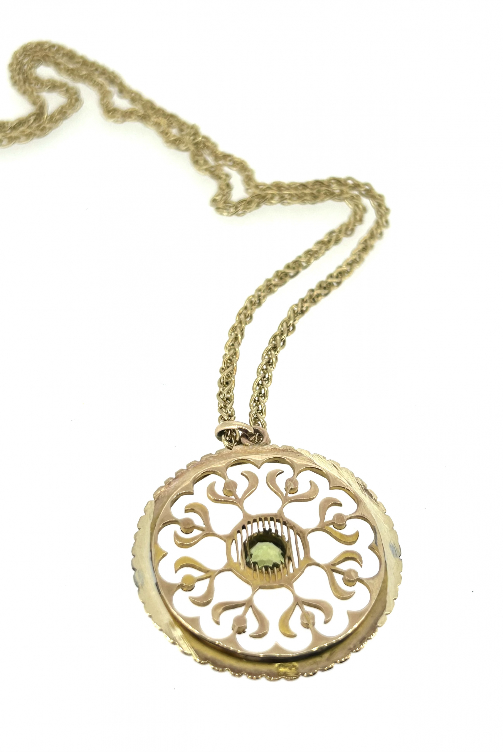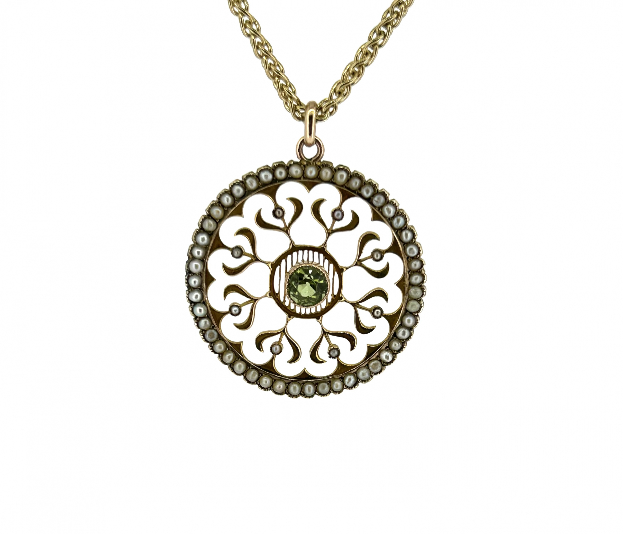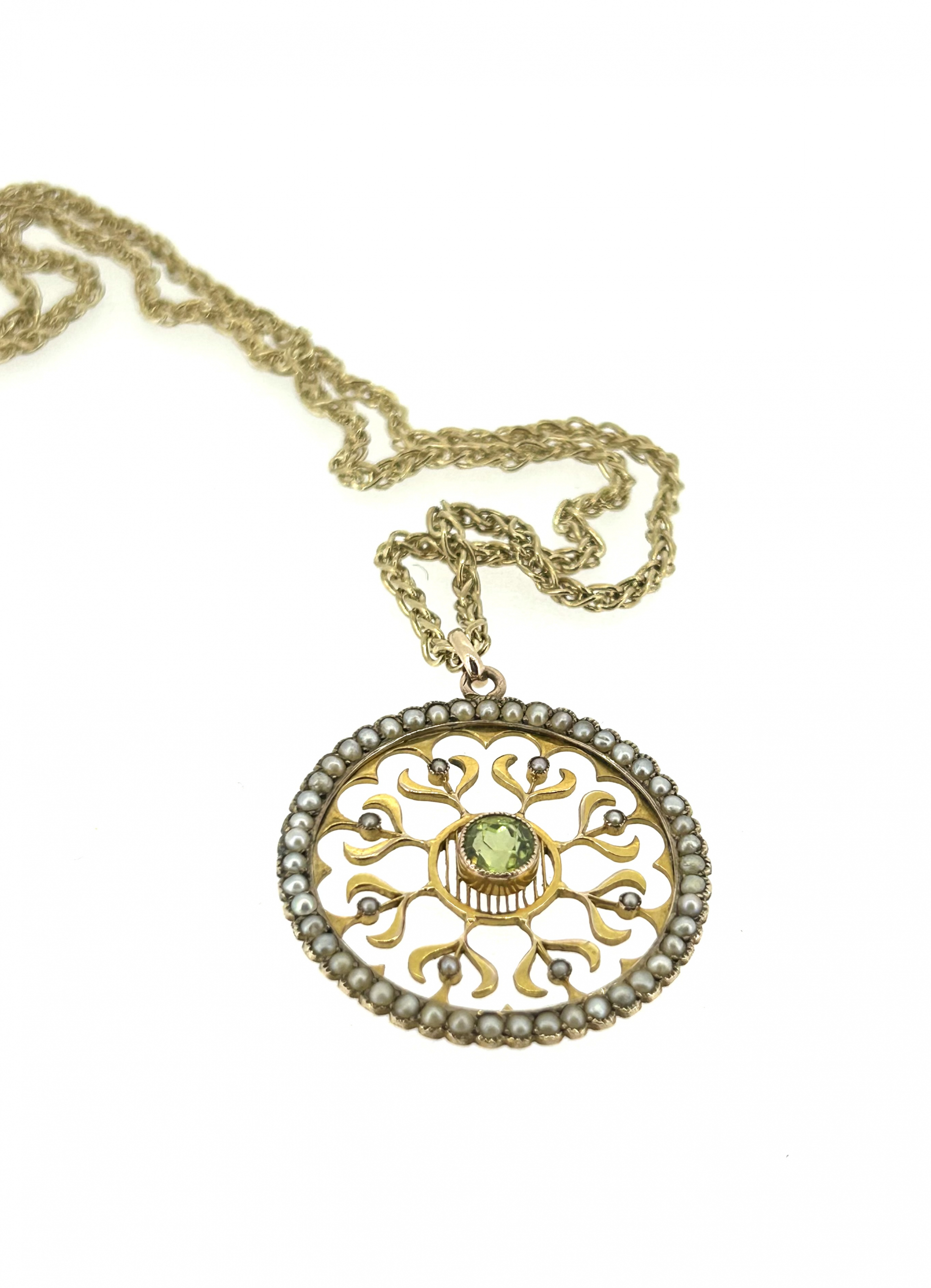 A beautiful 9ct Yellow Gold, Art Nouveau, Peridot and Seed Pearl Necklace from the 1910s.